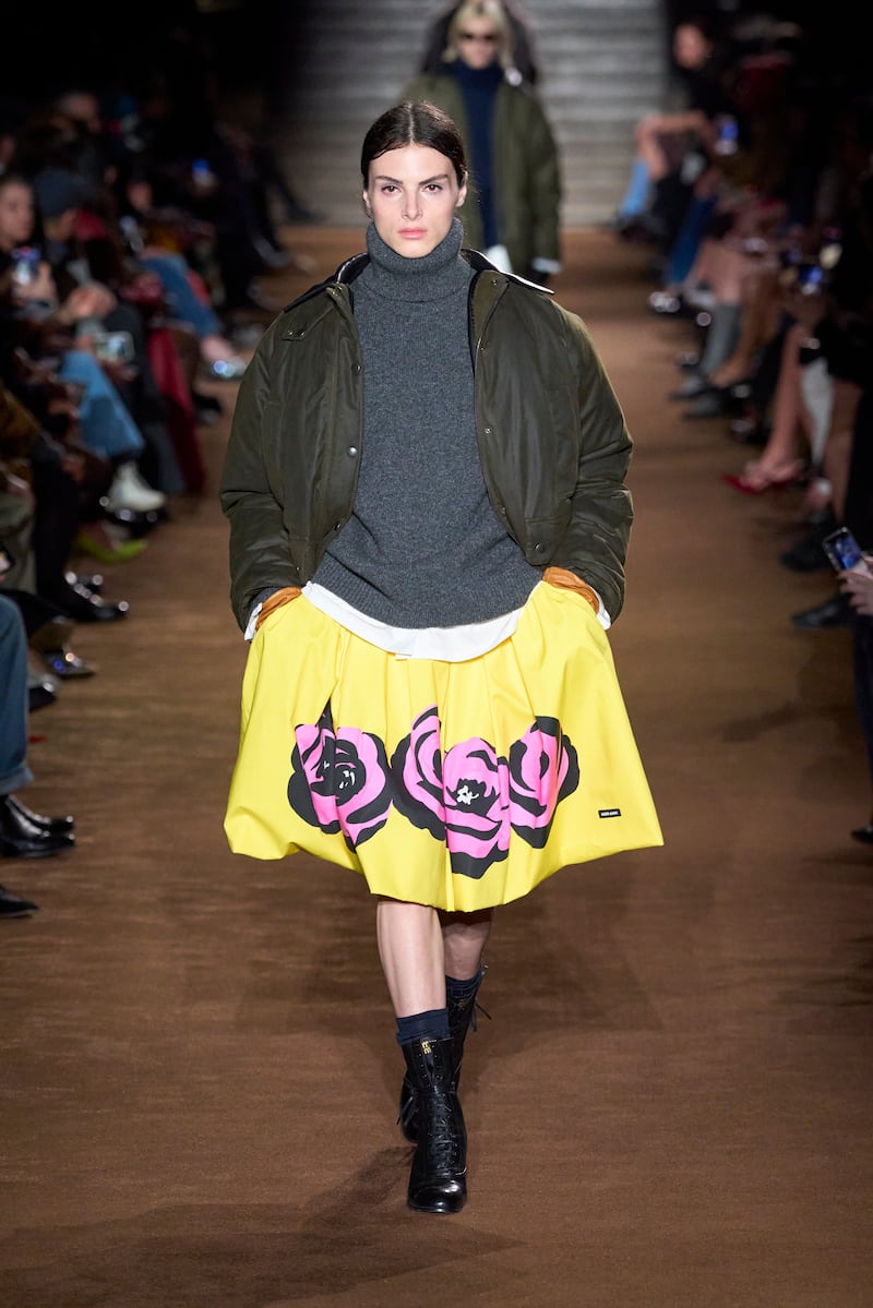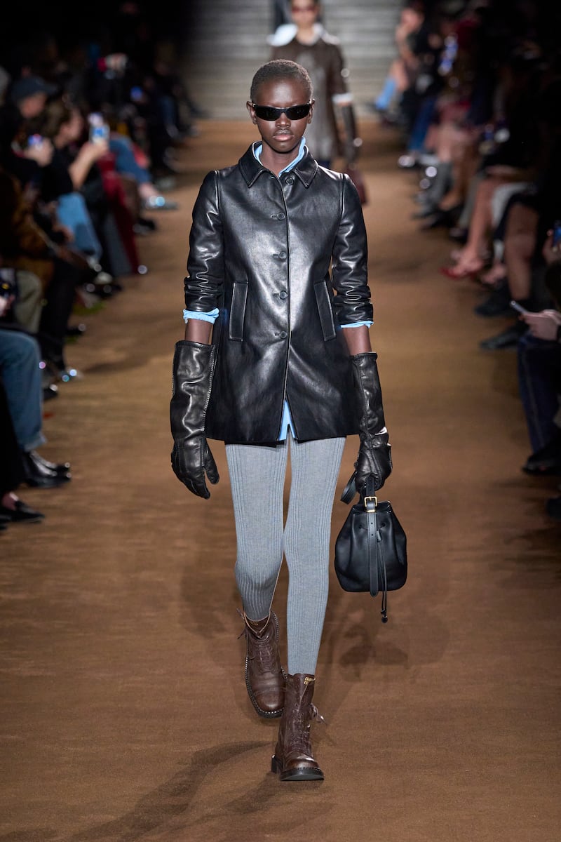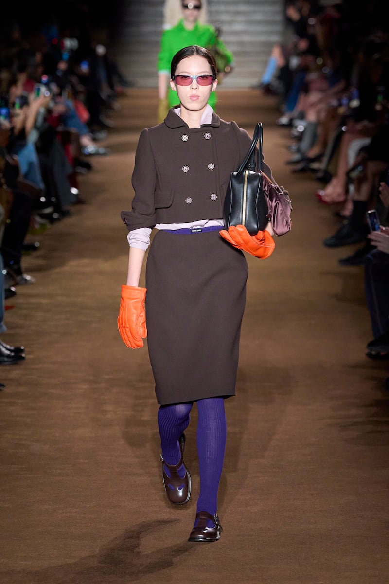 Lives lived were on the Miu Miu catwalk on Tuesday. Kristen Scott Thomas wore a grey flannel coat over white jeans. One of Prada’s eccentric customers gleefully sported a brown suede jacket crusted with embroidery. The last few seasons, Miu Miu flayed its mark on fashion with Miuccia’s indulgence of her fascination with girlishness. Now it’s the “lady” that intrigues her. Check the signifiers in the new collection: the gloves, the strings of pearls, the diamond brooches, the fur coats (“It’s not real,” she added quickly.) But it’s her natural inclination to defuse such emblems. Gigi Hadid wore her fur over what looked like a nurse’s uniform. That’s the kind of strange combination Miuccia thrives on. Uniforms, wool tights, parkas, what looked like policeman’s boots with a flaring skirt and poplin shirt. Kind of proletarian, because she’s never shelved the sensibilities which shaped her student years.