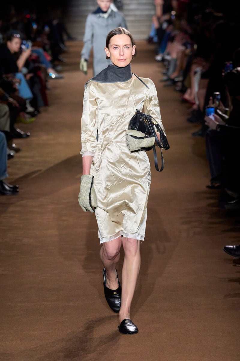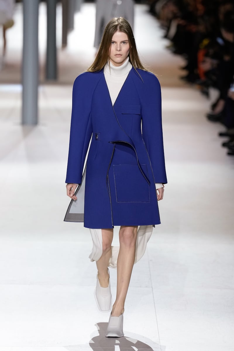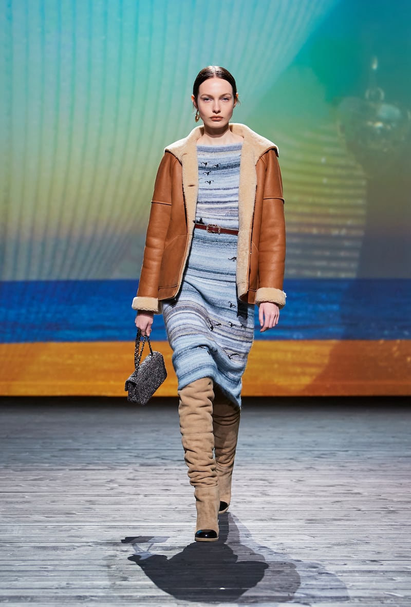 But light, long, lean coats (dusters almost) over tweed suits with belted jackets amplified the echo of classic Coco. The languor of beauty lost in love was pervasive from beginning to end, from slouchy knits to floaty tea dresses to a full-skirted hostess gown. But Viard also mixed in smart shearlings and leathers. And she anchored almost everything in boots (shearling-lined to the thigh, even), which made an authoritative noise as they stomped around the Deauville-ish board-cum-catwalk. There was, as ever, too much. A judicious edit of some of the more lumpen looks (tweed is as tweed does, especially in a culotte) would have sharpened the show’s impact. But Viard created a convincing full wardrobe with this collection, real but also infused with the Chanel mythos, which, in retailspeak, spells gold.