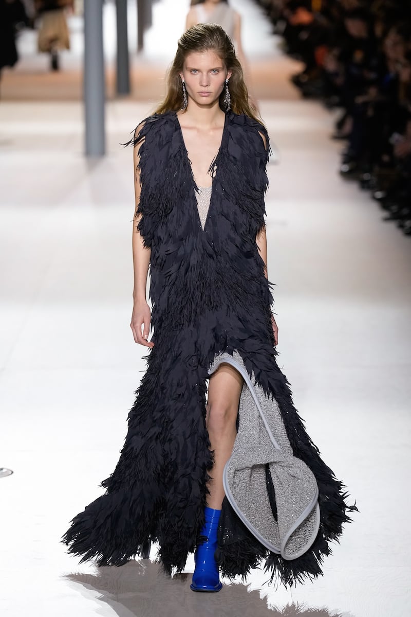 Tuesday was clearly a good day for the monolithic megabrands, because Nicolas Ghesquière transfused his tenth anniversary collection for Louis Vuitton with blood drawn from his stellar past (Balenciaga days, even). The procedure was immensely assisted by his artist collaborator Philippe Parreno, who designed a backdrop that will surely enter the annals of set design. A gigantic mothership structure, a spiky neon ball, fed signals to satellites around the 4500-seat marquee. Parreno has been designing these tented structures since 2006. LVMH’s deep pockets allowed him to create the sensation of suspension inside a dome that was being thoroughly surveilled by craft periodically roaring overhead with copter-like noise and probing lights. I felt like I was buried in the bowels of “The Creator,” a movie which the entire world needs to rush out and see, preferably in IMAX.