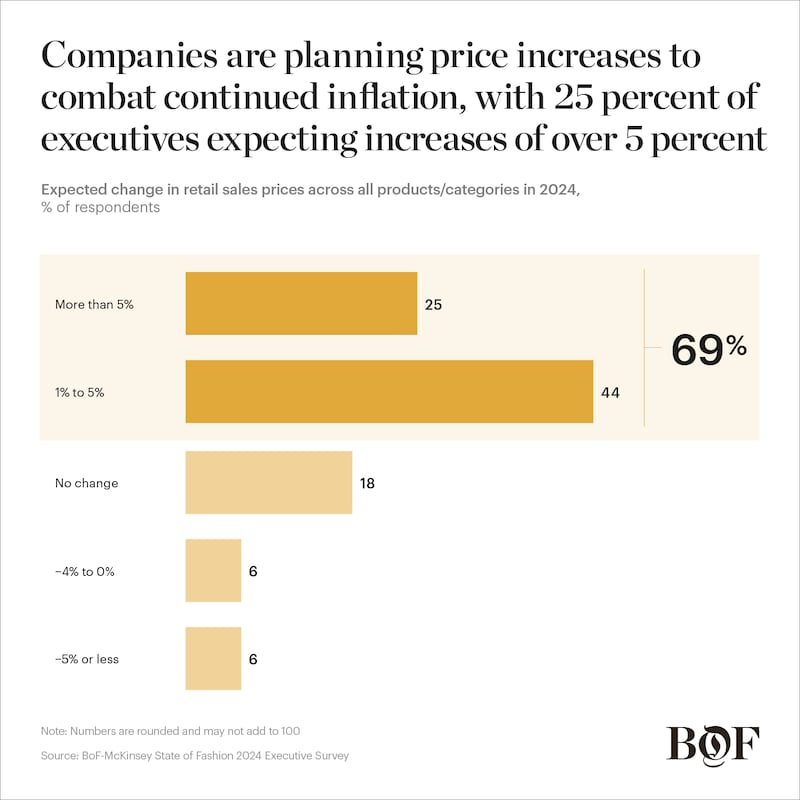 Looking ahead to 2024, 26 percent of respondents to the survey conducted in early September expected conditions to improve year on year, 37 percent expected conditions remain the same and 38 percent expected the situation to worsen, marking the biggest divide in executives’ expectations for the year ahead since the inception of the BoF-McKinsey survey in 2017. Yet the outbreak of the Israel-Hamas war in October underscores the uncertain environment, raising questions about whether a regional widening of the conflict could impact the global economy and have ramifications for the fashion industry.